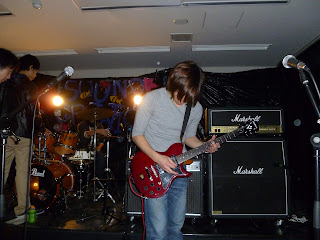 A friend of mine introduced me to them. But when I bring them up with Japanese friends, they've never heard of the band. And when I bring up Heavy Metal bands from America or Europe, most of the time my Japanese friends have never heard of them or even like the music. Some friends though have heard of some of the bands and do like some Heavy Metal music. But these friends are very few and far between. This past weekend at the Kansai Gaidai school festival, I got to see some rock bands perform in Building 2. One of my friends, Ryuhei, was a guitarist in one of the bands and I was able to see him peform a few times. The picture immediatley below is my friend Ryuhei getting ready for the performance.